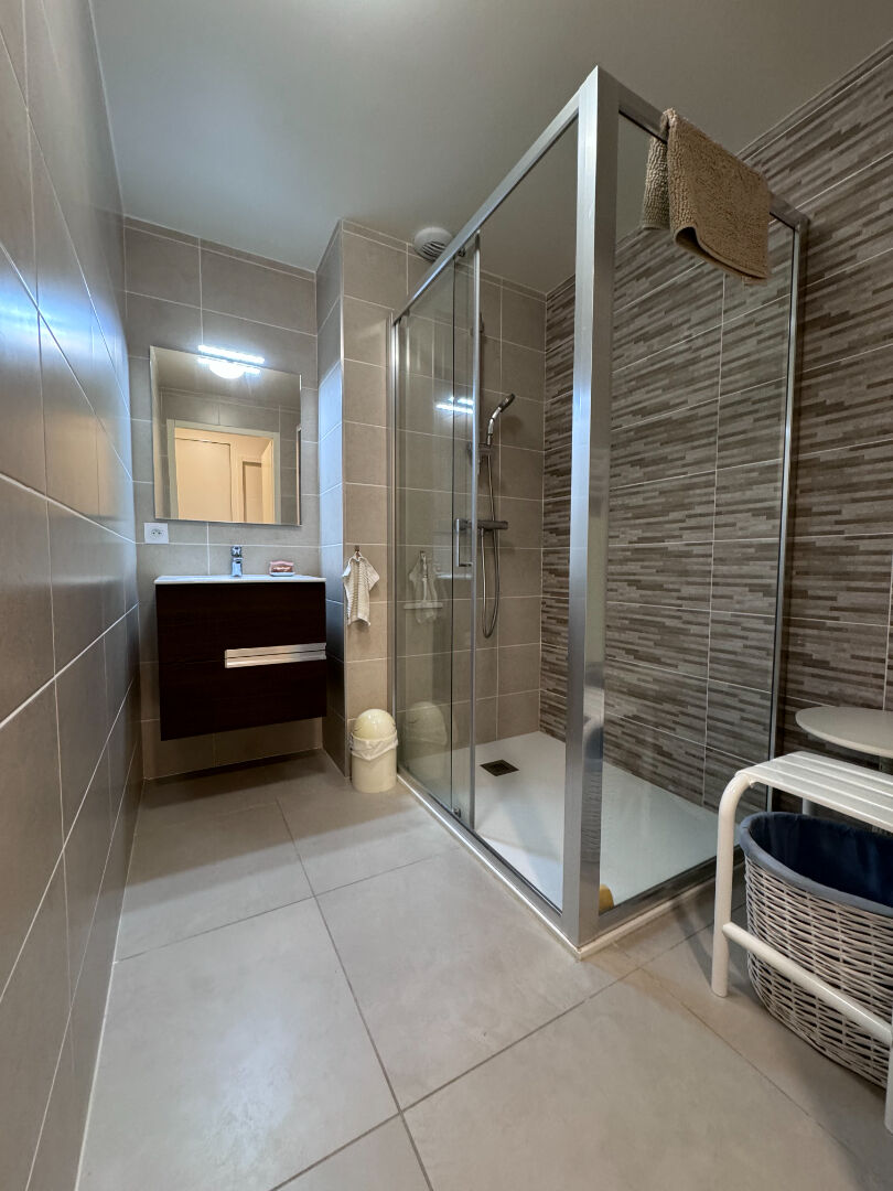 Salle d’eau moderne avec douche à l’italienne et WC séparé.